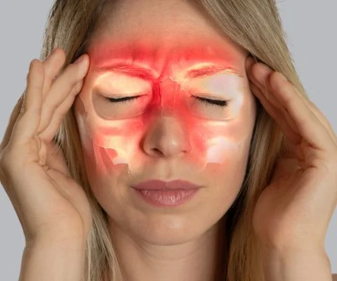 Dor ou pressão no rosto; (testa, olhos, bochechas);